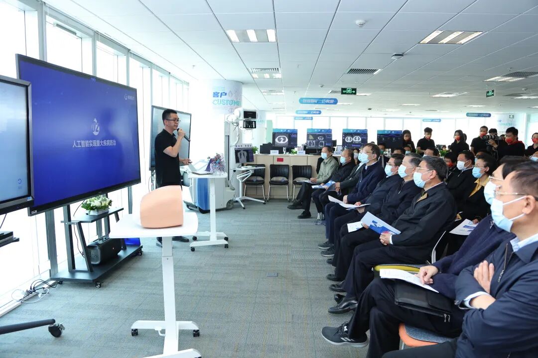 在推想医疗展示区,陈宽向调研组一行介绍了企业创业初心,汇报了企业发展现状,展示了产品应用和价值及国际化成果等内容。通过生动的可视化展示和医疗行业专家代表的现场解读,调研组直观了解到人工智能技术在医院场景全周期使用和价值。