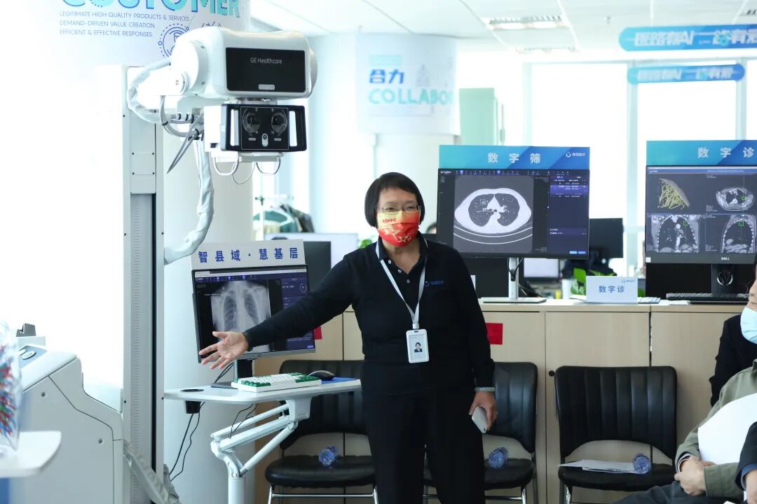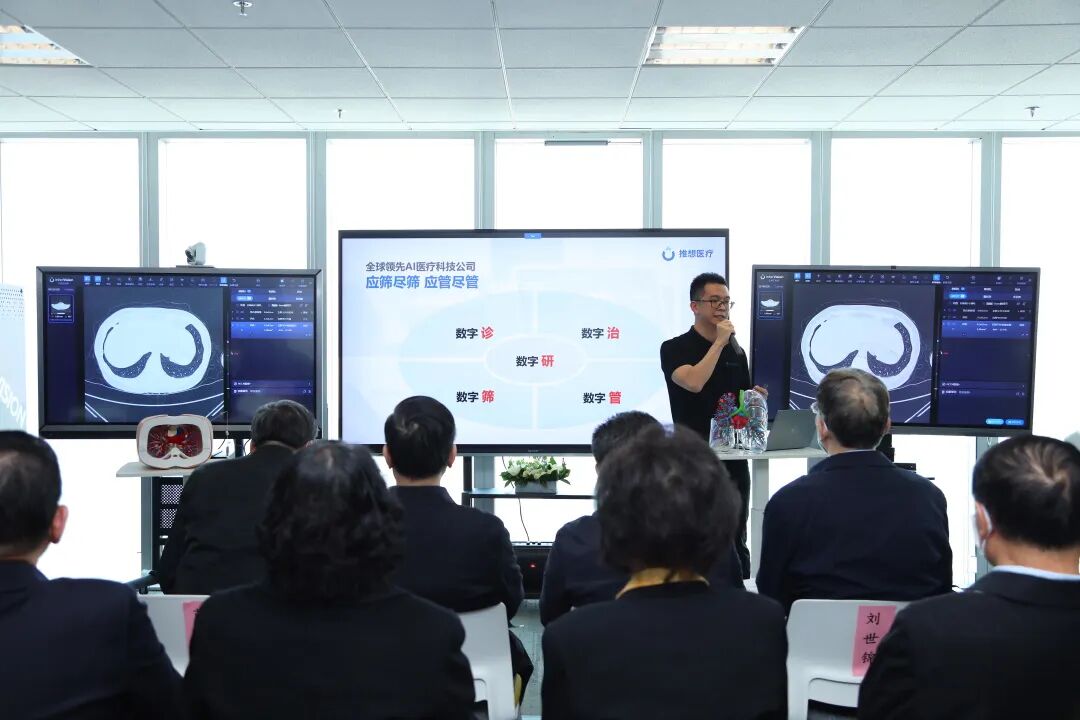 下午,调研组一行人又考察了推想医疗位于首都创新设计研究院智慧生活实验室内的展厅,现场了解针对肺癌的早筛、科普和患者管理等内容。